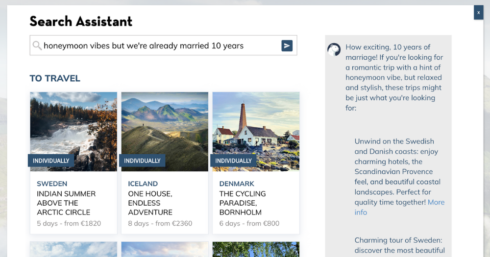Cuando alguien busca «un lugar que se parezca a las historias de mi abuela sobre la vieja Europa», Maya traduce ese sentimiento en destinos, alojamientos y experiencias específicos de tu inventario único. Considera factores como los estilos arquitectónicos, la autenticidad cultural, el atractivo generacional y las oportunidades para contar historias.